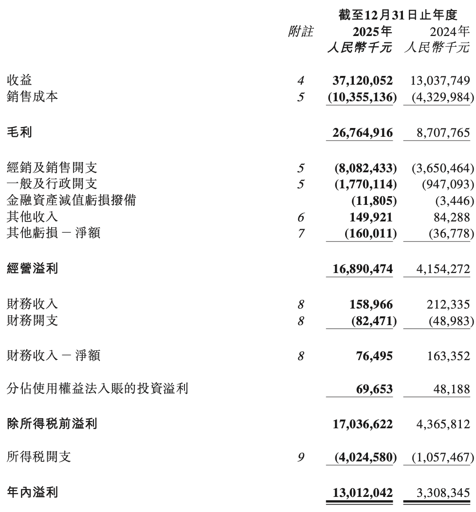 2025年,泡泡玛特交出一份几乎无懈可击的财报:全年营收371.2亿元,同比增长184.7%;经调整净利润130.8亿元,同比增长284.5%;毛利率从2024年的66.8%跃升至72.1%,创历史新高。